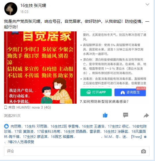 在抗击新型冠状病毒感染的肺炎疫情的斗争中,我院学生党支部坚决响应上级党组织要求,充分发挥基层党组织战斗堡垒作用,利用网络新媒体,配合学校完成调查问卷,在QQ空间、QQ群、朋友圈等网络平台分享疫情实时动态,宣传防疫知识等。时刻关心同学动态,配合学院彻底摸底排查梳理,以自身防疫为先,号召我院同学为抵御疫情献上绵薄之力,切实发挥好党员先锋模范作用。