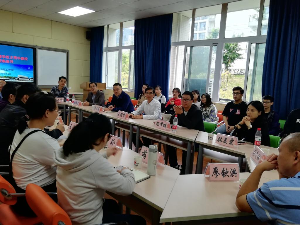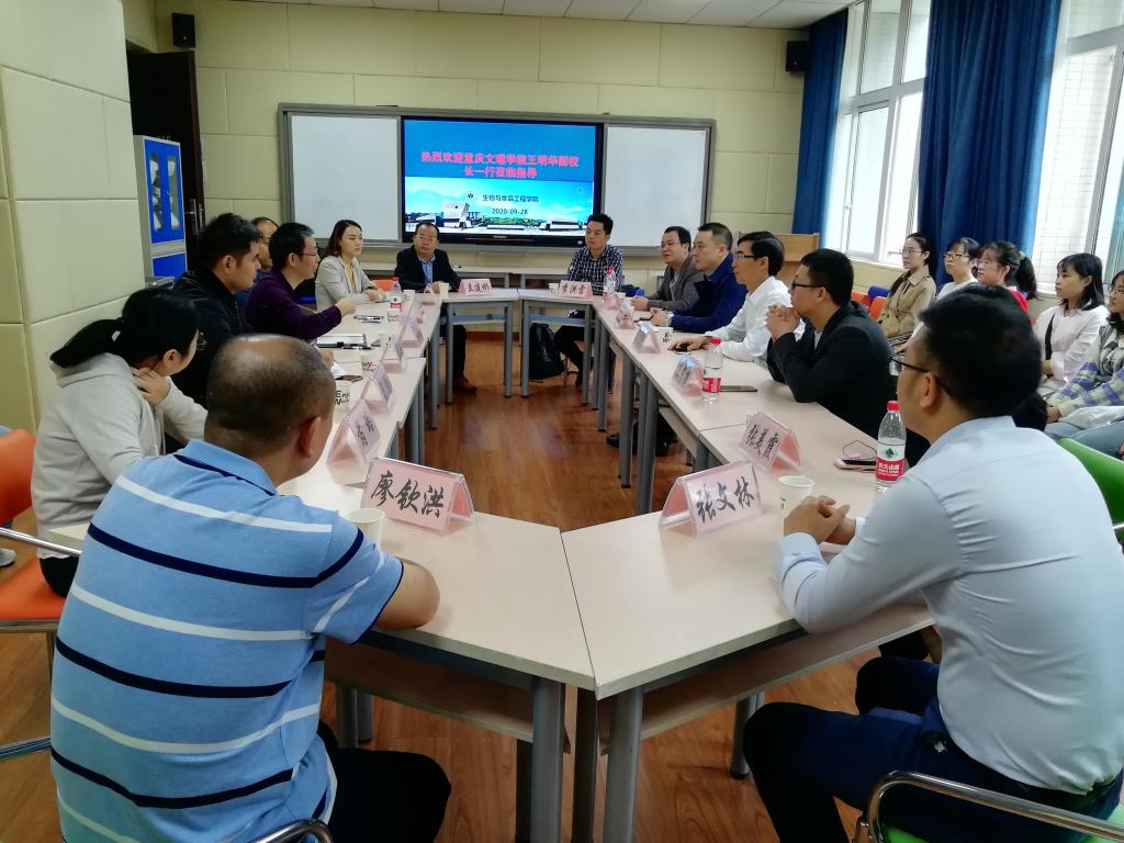 2020年9月28日,重庆文理学院副校长王明华、研究生处副处长樊汶樵、园林与生命科学学院党总支副书记孙翰昌、园林与生命科学学院副院长陈泽雄、以及兼职硕士生导师一行十人来我院进行座谈交流。我院院长肖国生、食品科学系主任王兆丹、园艺生物系主任石汝杰、负责研究生工作的老师杨玲和芮璐、以及2020级新入学的研究生参加了此次座谈。