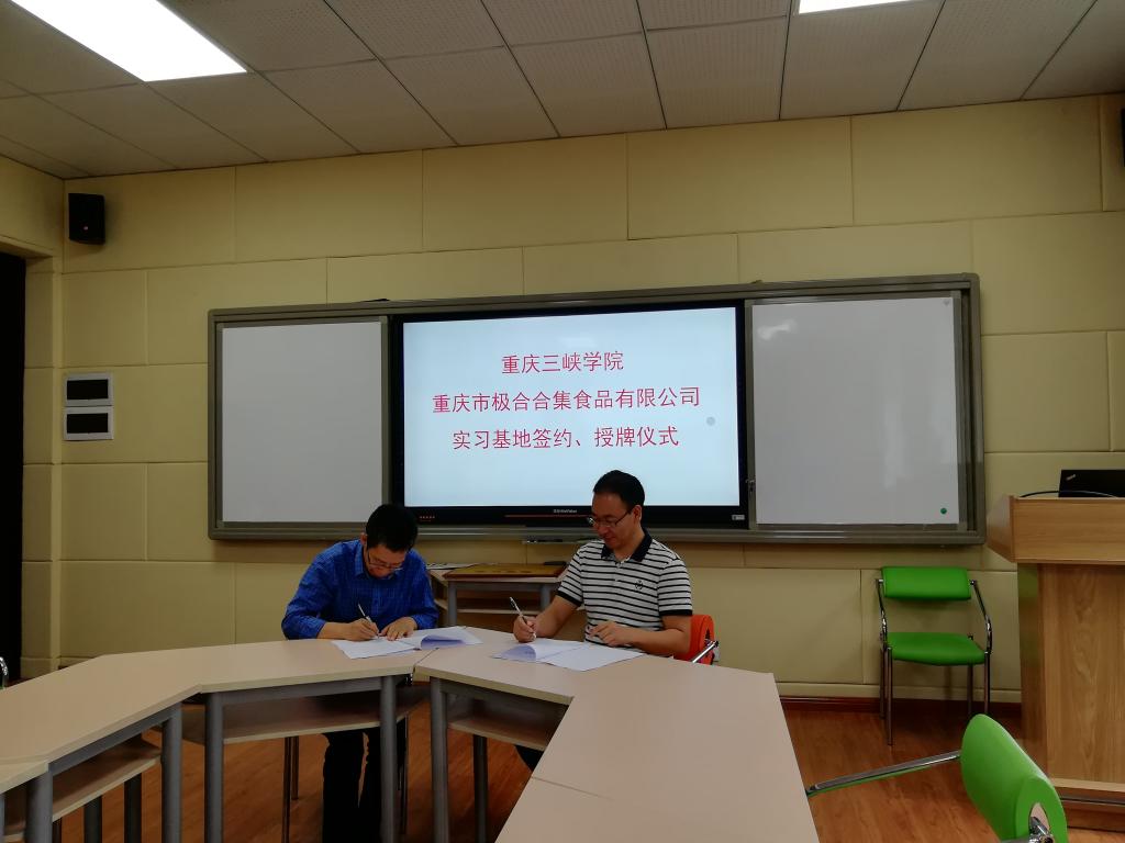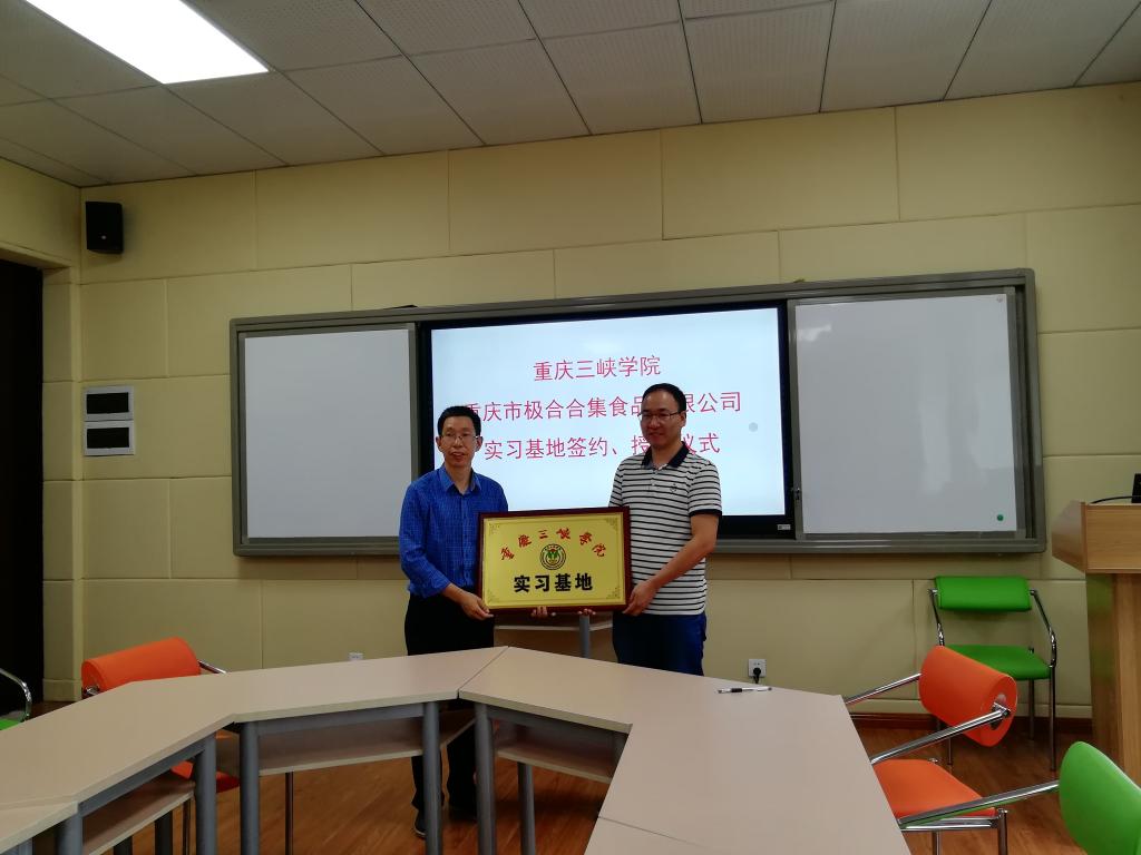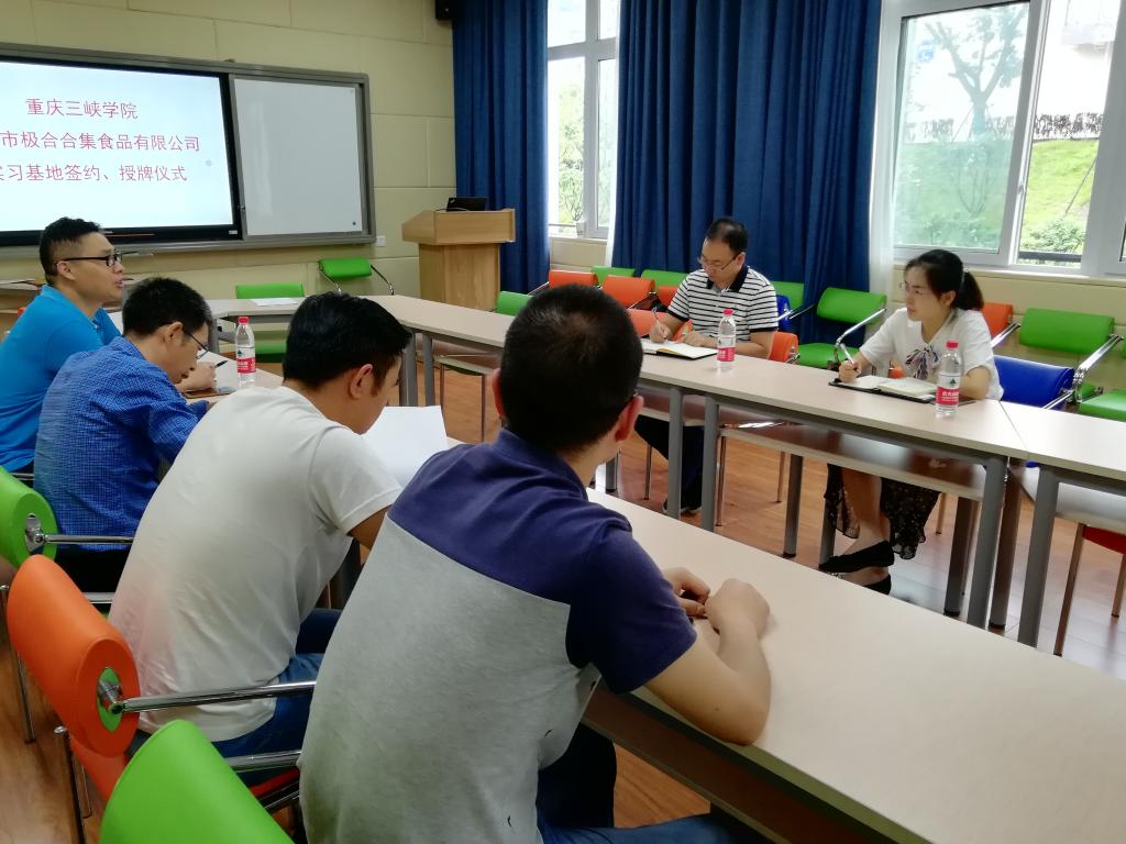 2019年6月17日,2003网站太阳集团与重庆市极合合集食品有限公司共建实习基地的签约授牌仪式在我院举行,重庆市极合合集食品有限公司陈俊逸总监、周玉兰经理和我院院长肖国生、示范中心主任曲留柱、实验室主任唐华丽、学工办主任李华林出席了签约授牌仪式。