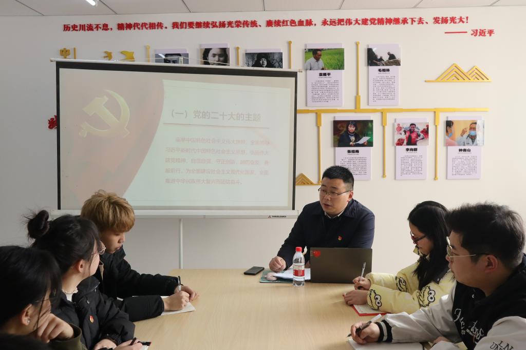 2月23日下午,学院党总支书记骆孟鑫在“初心工作站”为联系班级、社团、寝室学生代表宣讲党的二十大精神。