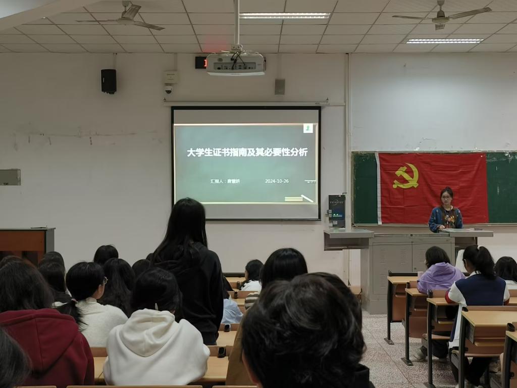 主讲人唐慧妍同学分析了大学生考取证书的必要性,介绍了证书的概述与分类、热门证书详解及实用性分析、证书考取的策略与建议,用张雪峰老师的视频进一步强调了哪些是有用的证书,该如何考取相关的证书。活动尾声,同学们积极分享了自己考取证书的经验,纷纷表示对考取证书有了更加清晰的目标。