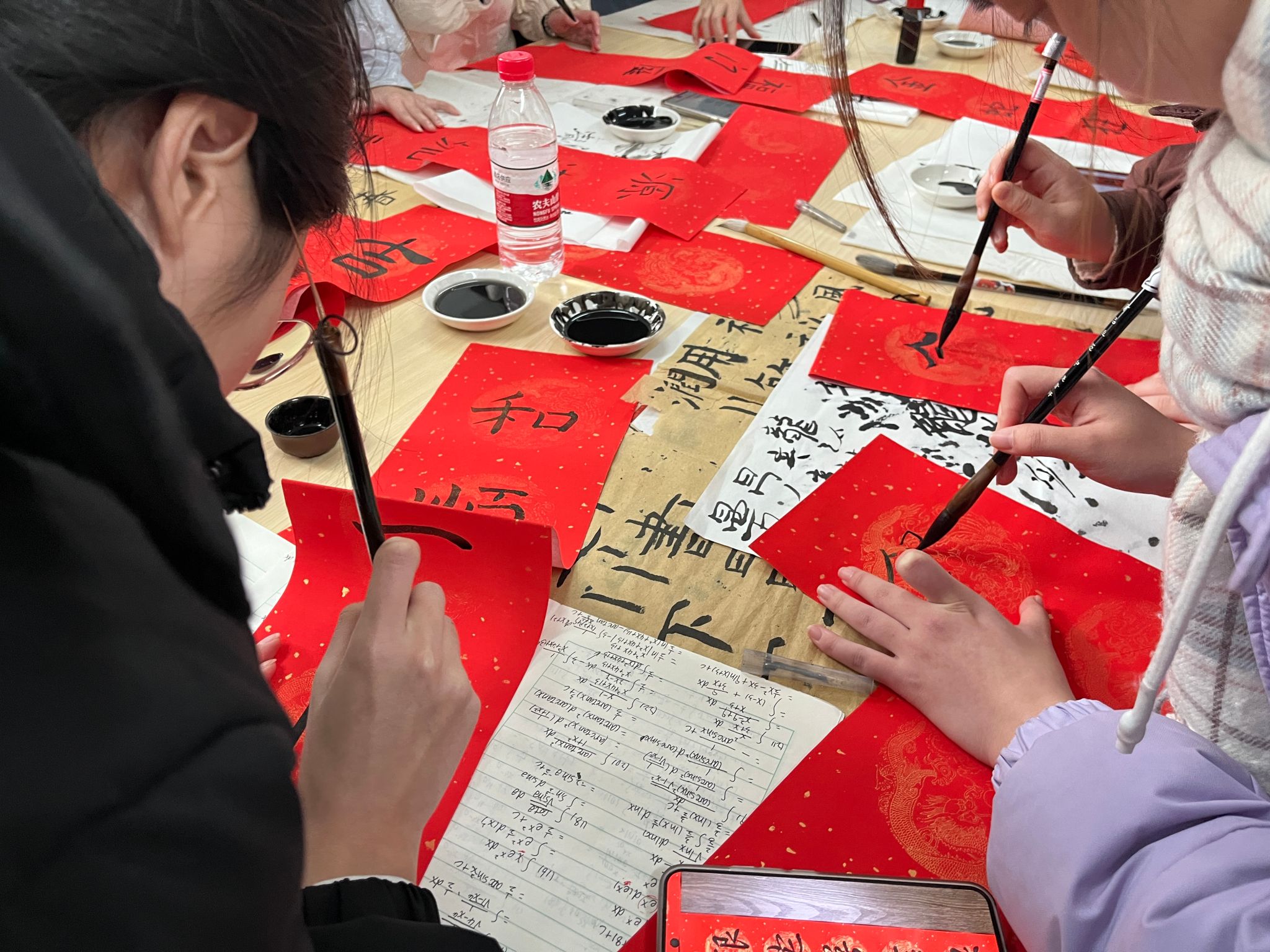 墨香飘逸,寒冬不“寒”。活动现场工作站成员提前将准备好的对联纸、毛笔和墨水等工具摆放在桌上,由工作人员林莹简单介绍有关冬至的来源、特点、习俗以及写对联的知识和要求。参与人员自行结伴,两两一组共同创作一副对联,大家挥洒笔墨,写下的对联包含了对人生美好的祝愿以及对冬至节气的感受,还有同学巧妙地将自己的名字融入到对联中表达了对新一年的期盼。最后,每组同学依次介绍了作品的创作理念和含义,纷纷表示此次活动让她们进一步学习到了有关冬至、对联的文化,感受到了节日的氛围和生工学院的温暖。