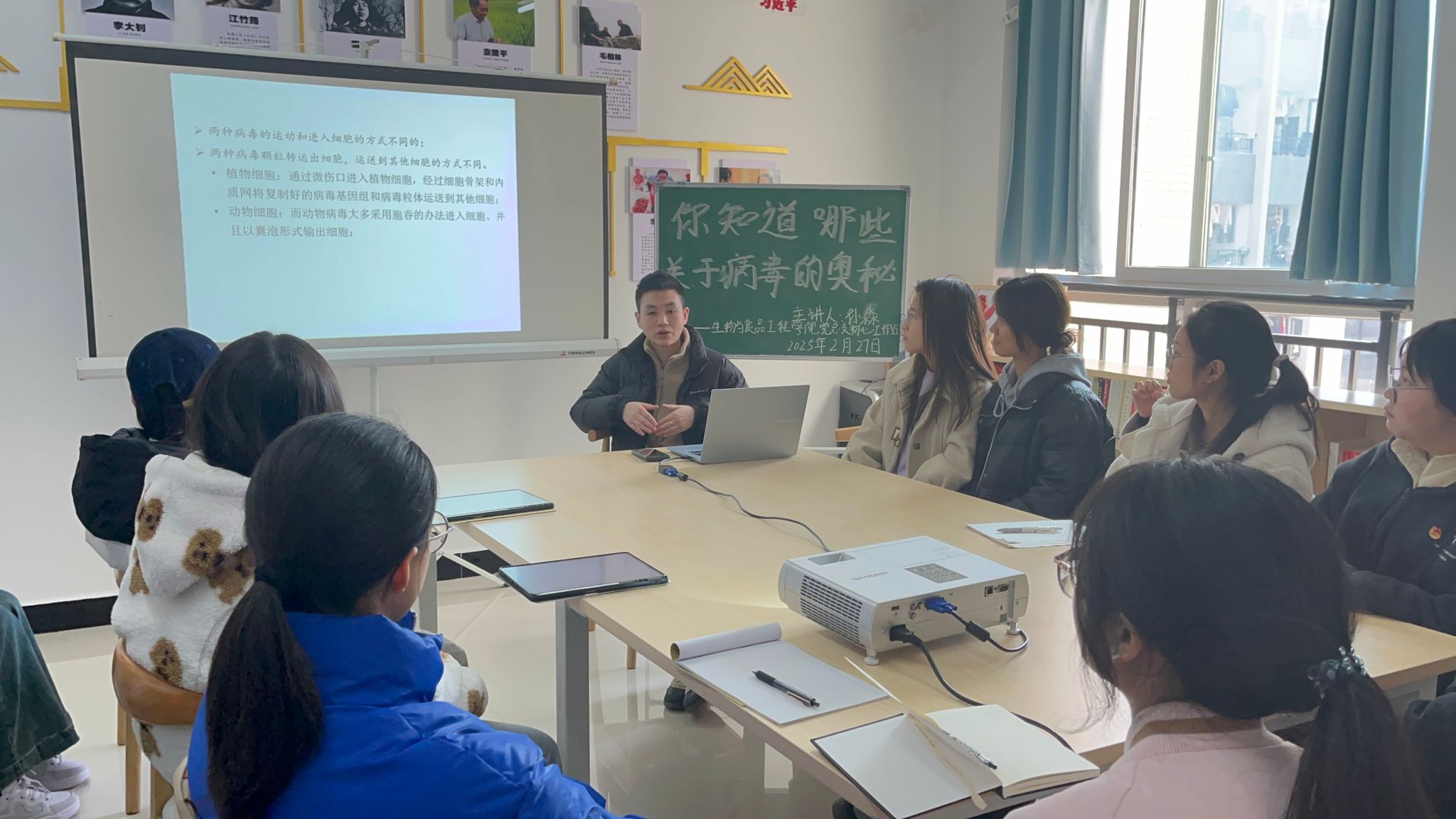 为普及生命科学知识,增强学生健康防护意识,2月27日下午14:30,我院初心工作站在蓝雾苑2舍4楼活动室开展第43期“寝室工作日”活动。本期活动以“你知道哪些关于病毒的奥秘?”为主题,孙淼老师担任主讲,共计20人参加。