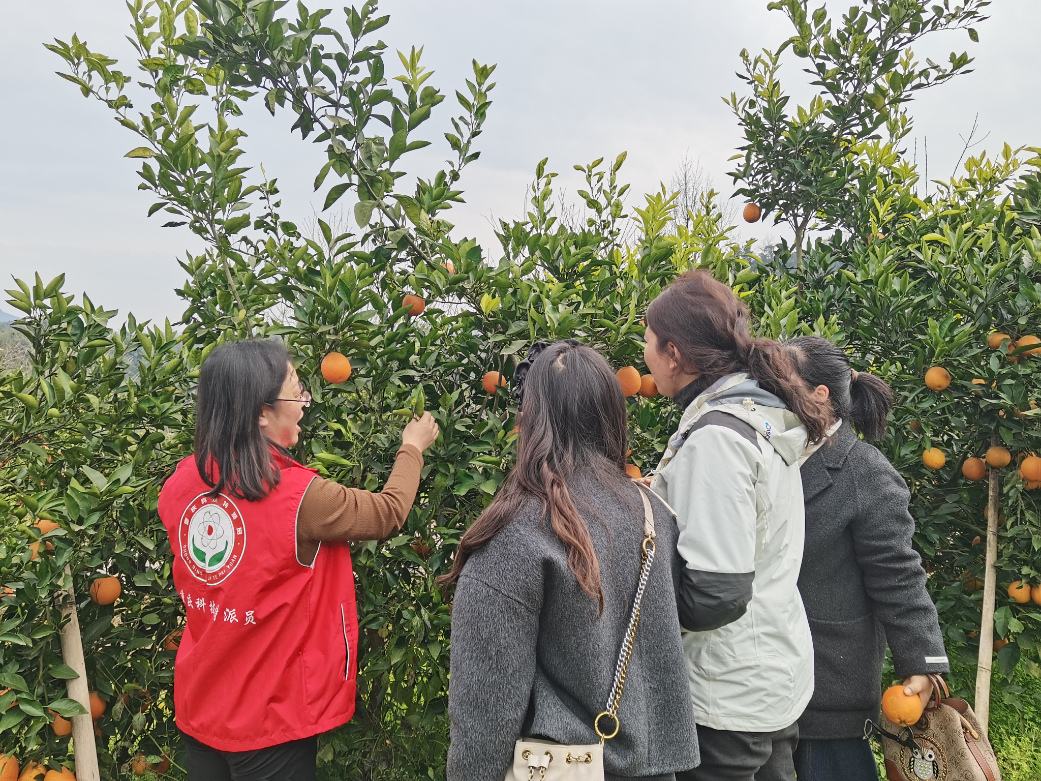 在实地调研环节,果园负责人详细介绍了玫瑰香橙的产业现状与发展瓶颈。学院教师团队结合专业特长,通过现场示范与互动答疑,就柑橘品种优化、病虫害绿色防控、果实采后加工等关键技术开展指导。