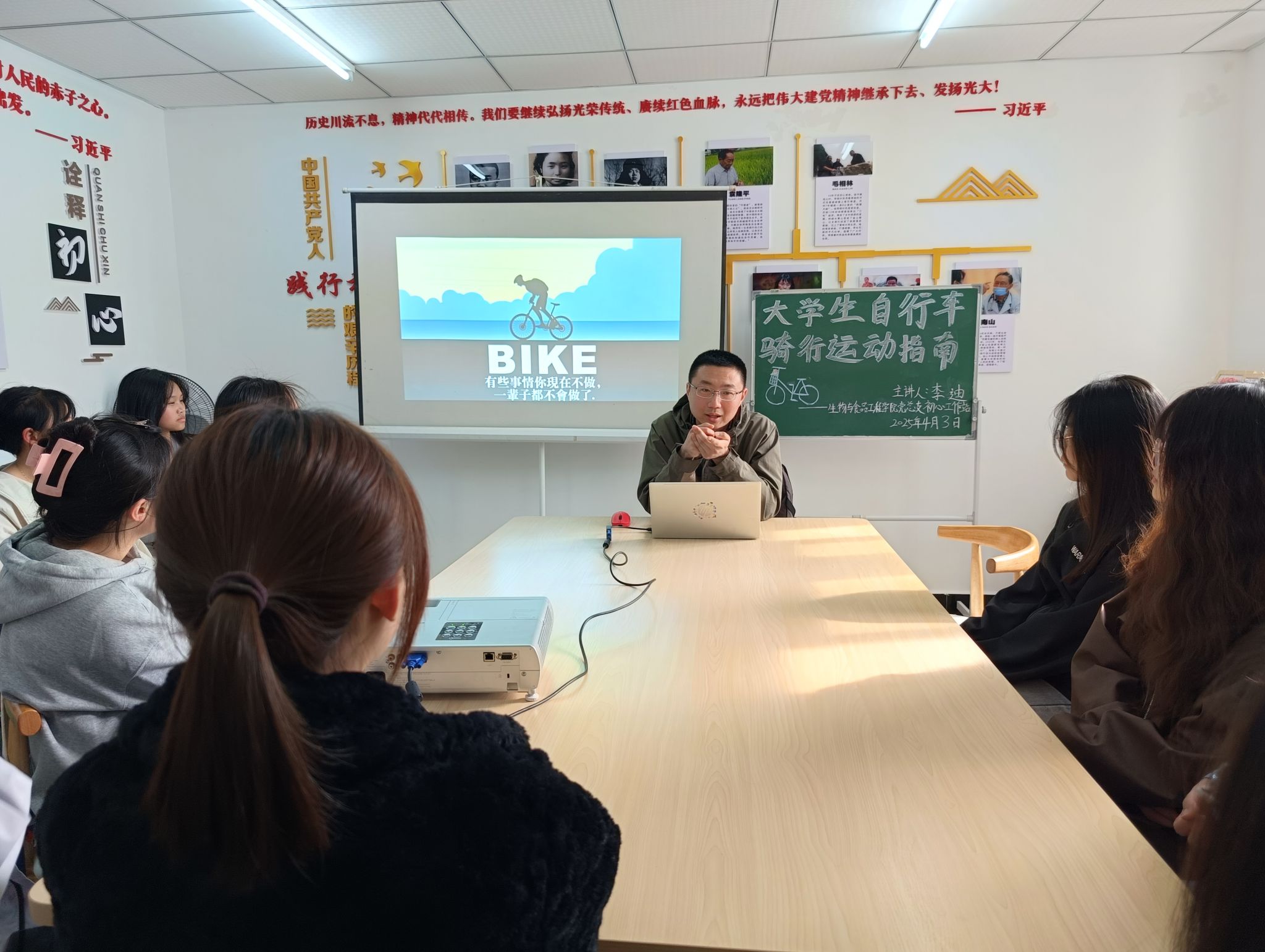 活动伊始,李迪老师先是向同学们讲述了自己对于骑行运动从接触到喜爱的一系列心路历程,然后从骑行历程、骑行的好处、骑行扫盲、老骑友的忠告五个方面详细地向同学们进行分享。向同学展示要如何学习骑自行车、骑好自行车的小技巧以及骑行中的注意事项。还有针对骑行设备,老师也向同学们介绍了各种自行车及其品牌,并用《岳阳楼记》中的名句“不以物喜,不以己悲”告诫同学们不要有攀比心理,明确自己的定位,设备适合自己最重要。最后,李迪老师告诉同学们有些事情现在不做,以后可能都不会做了,所以要珍惜大学生活,抓住机会。