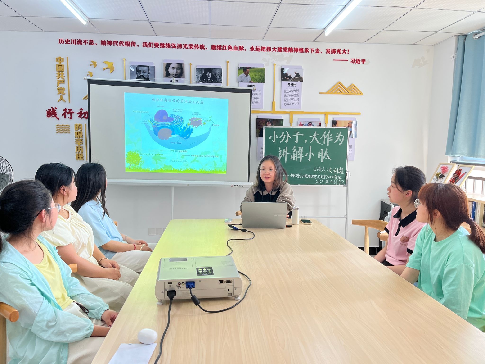 为深入学习多肽的营养生理功能和应用场景,4月17日14:30,我院初心工作站在蓝雾苑2舍4楼活动室开展第49期“寝室工作日”活动:小分子,大作为,讲解小肽,共计7人参加。