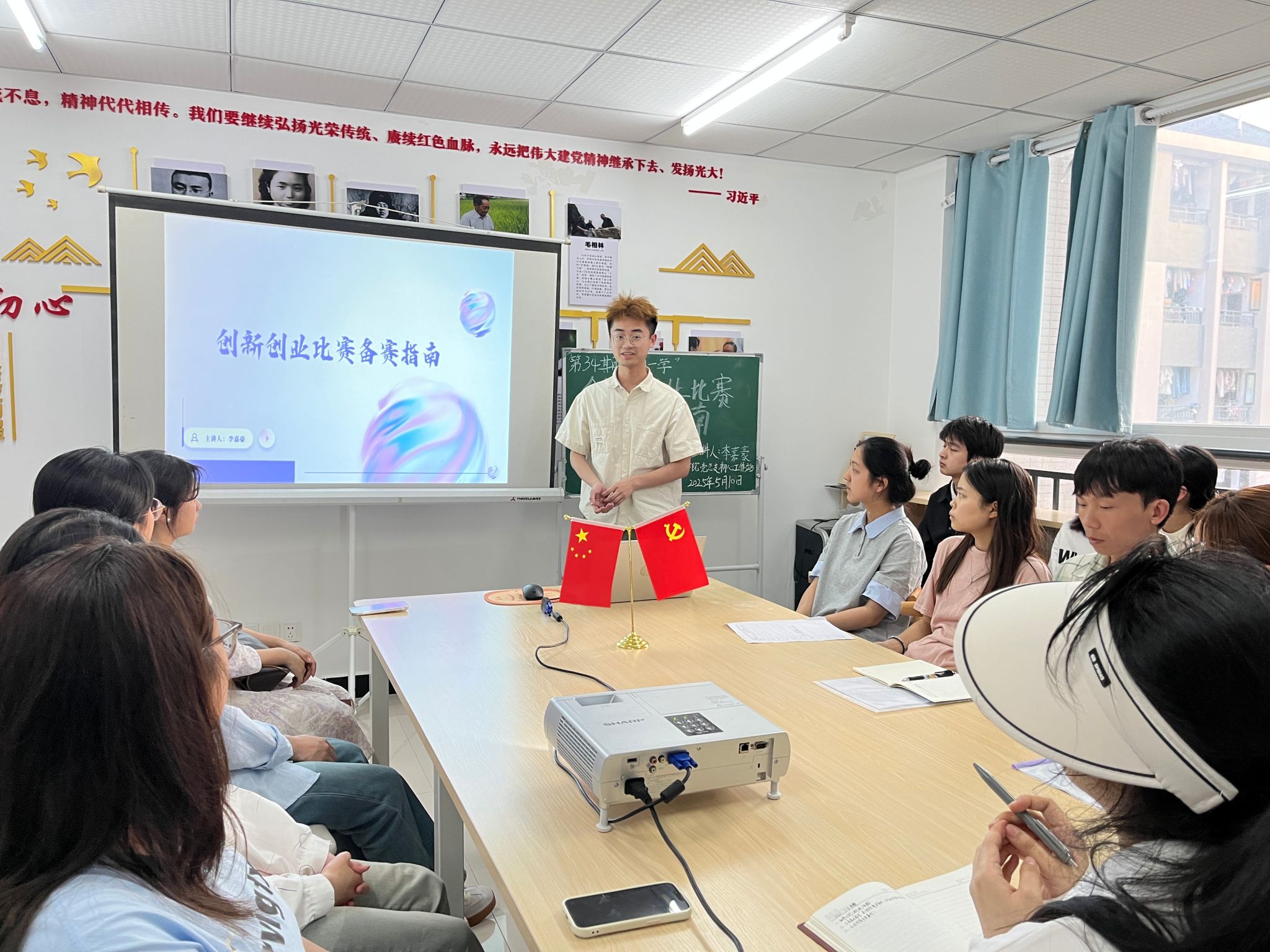 为激发同学们的创新创业热情,提升创新创业能力,更好地备战各类创新创业赛事,5月10日19:00,我院初心工作站在蓝雾苑2舍4楼活动室举办第34期“每周一学”活动:李嘉豪同学讲解创新创业比赛备赛指南,共计20人参加。