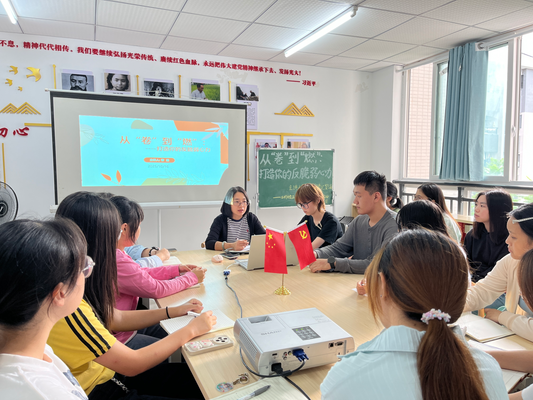 党总支副书记黎涵围绕“如何打造反脆弱心力抗震系统”展开分享,聚焦“盲目卷”“疲惫卷”“挫败卷”三类现象,指出盲目跟风可能引发身心俱疲、生活节奏失衡等危害。她强调,搭建反脆弱心力抗震系统至关重要,它是个人成长、职业发展与心理健康的核心动力。黎涵老师分享了搭建反脆弱心力抗震系统的方法:一是转变叙事,从被动抱怨到主动掌控,明确努力方向;二是拥抱失败,借“失败日记”反思总结,化失败为成长契机;三是设计能量加油站,用番茄工作法、心流活动、有效社交等方法,可化压力为动力。
