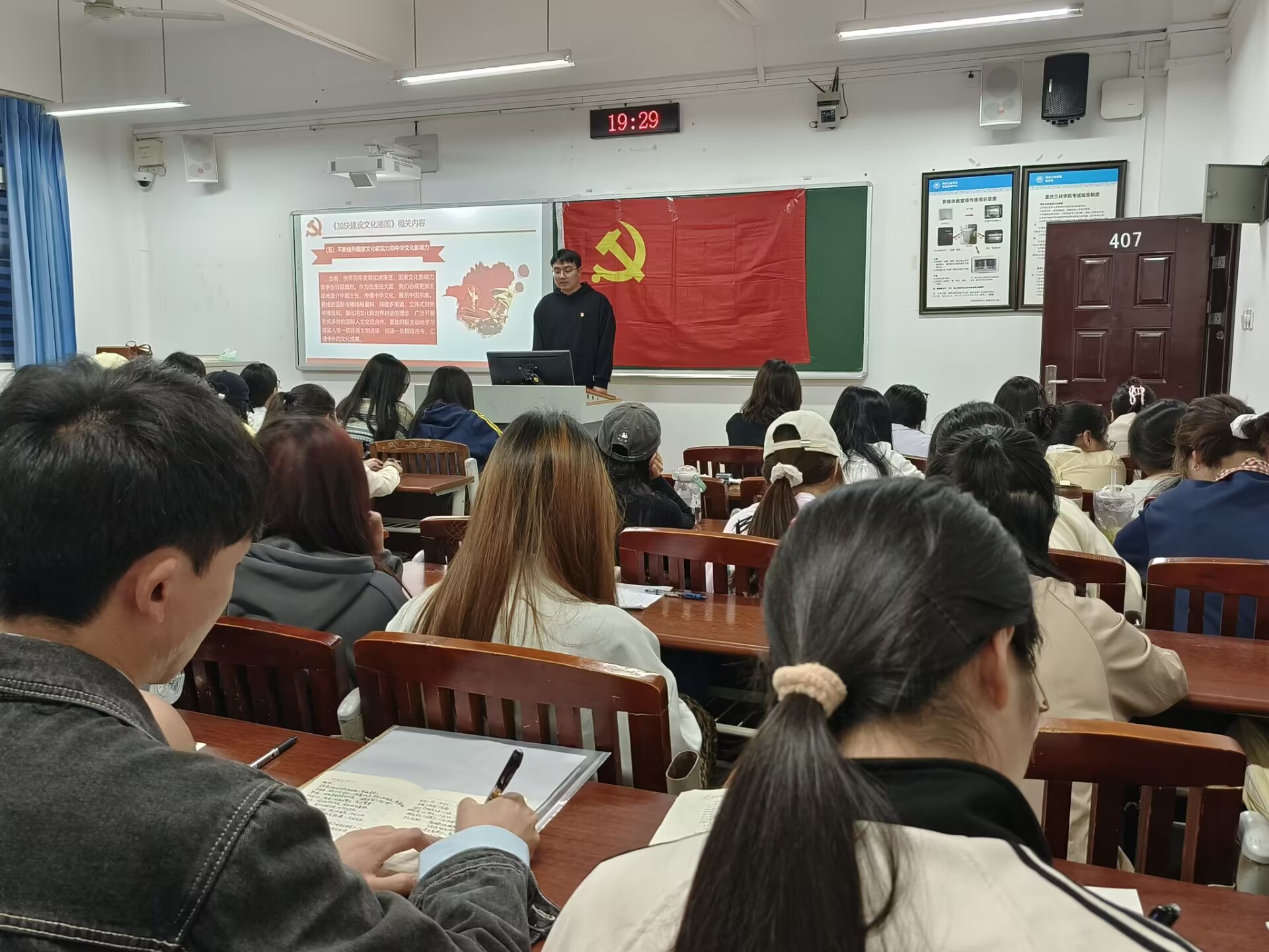为深入学习领会文章精神,推动文化强国建设在基层落地生根,4月26日19:30,我院初心工作站于明辨楼1栋407教室开展“理论学习”活动:学习习近平总书记在《求是》杂志发表的重要文章《加快建设文化强国》,共计60人参加学习。