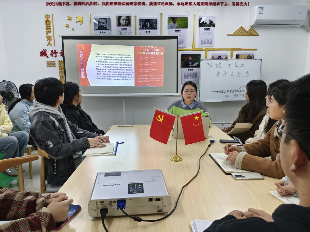 12月6日20:00,我院初心工作站于蓝雾苑2舍4楼活动室开展第28期“理论学习”活动。李洪琳同志以“解读‘十五五’,青年勇担当”为主题展开分享。共计15人参加。