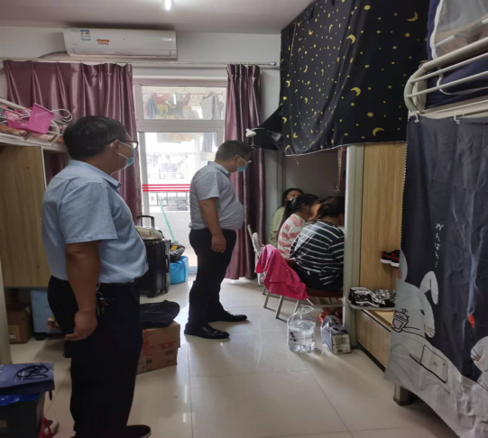 在学校对疫情防控特殊时期总体部署下,为贯彻落实学校疫情防控工作会议精神及有关要求,了解关心学生在宿舍的学习生活状态,9月5日下午,我院党总支书记骆孟鑫、副书记陈文剑带领全体辅导员深入走访学生宿舍。