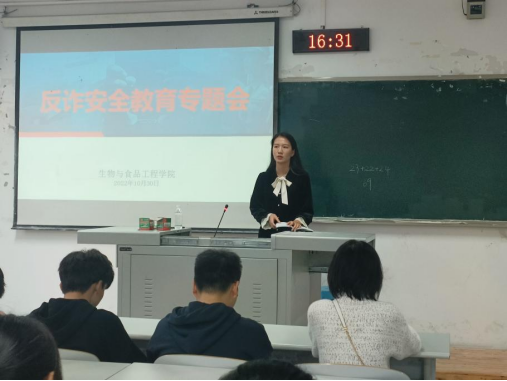 2022年10月30日,我院于明辨楼1栋202、204分年级开展反诈骗专题教育,辅导员龚莉、龙颖、许美琳、熊小飞主讲,我院全体学生参加。