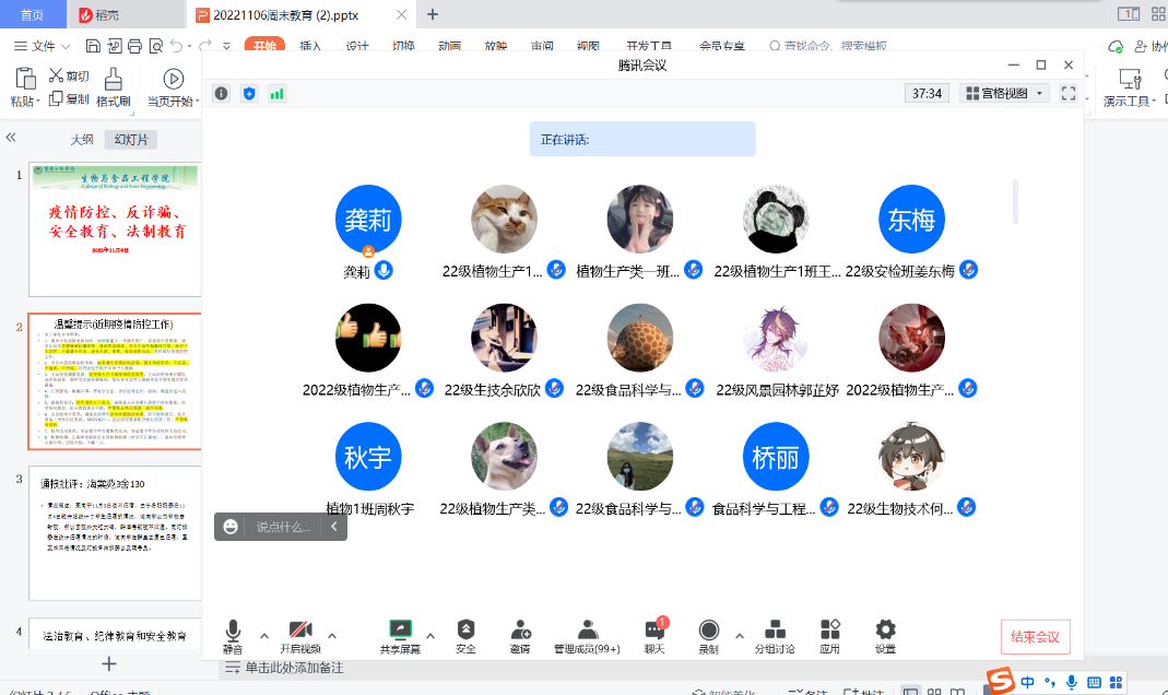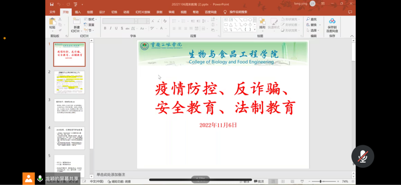 2022年11月6日,我院辅导员分年级开展线上疫情防控、反诈骗、安全教育、法制教育专题周末教育,我院全体学生参与。