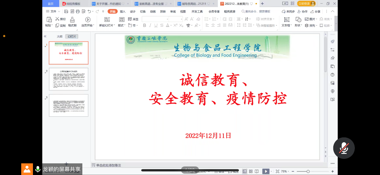 12月11日下午,我院辅导员熊小飞、许美琳、龙颖、龚莉分年级开展线上诚信教育、安全教育、疫情防控专题周末教育,我院全体学生参加。