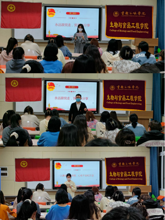 活动共分为四个环节。首先,团学骨干代表樊丽娟向参会人员讲述党为二十大召开所做的准备工作,并从奋进新征程和建功新时代两个方面带领大家走进二十大、共迎二十大。接着,中共党员黎欢同志、任芝雨同志和中共预备党员张兴源同志依次分享他们如何学习党史、如何理解党的历史经验成就和革命先辈的先进事迹,号召广大青年学生坚定党的领导,永远跟党走。然后,团学骨干刘欣悦和罗旋作学习感想表示,我们青年学生要自觉担当时代重任,开新局,谱新篇,努力成为可堪大用能担重任的栋梁之才。最后,团学骨干代表樊丽娟作学习总结,呼吁我们要坚定理想信念,传承红色基因,补足精神之钙,在新时代新征程中奋勇争先建功立业。