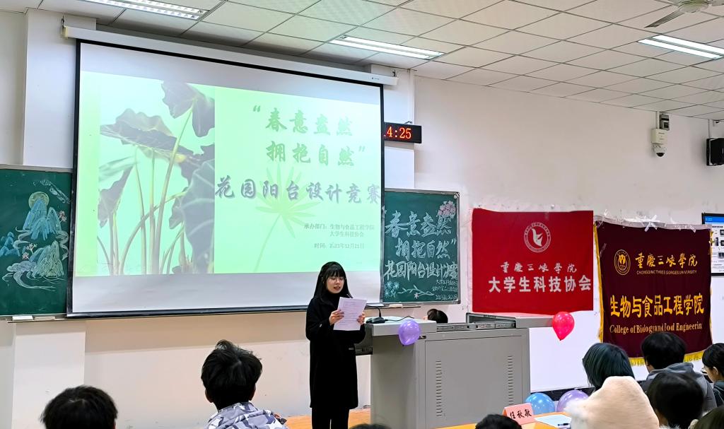 12月21日14:20-16:20,由重庆三峡学院科普基地主办,我院大学生科技协会协办的“春意盎然,拥抱自然”花园阳台设计竞赛在明辨楼2-203顺利举办。本次竞赛由团总支(学生)副书记彭小烨,学生会主席团成员吴圣杰、欧巧钰,团联主席任秋敏担任评委,共计120余名同学参加。