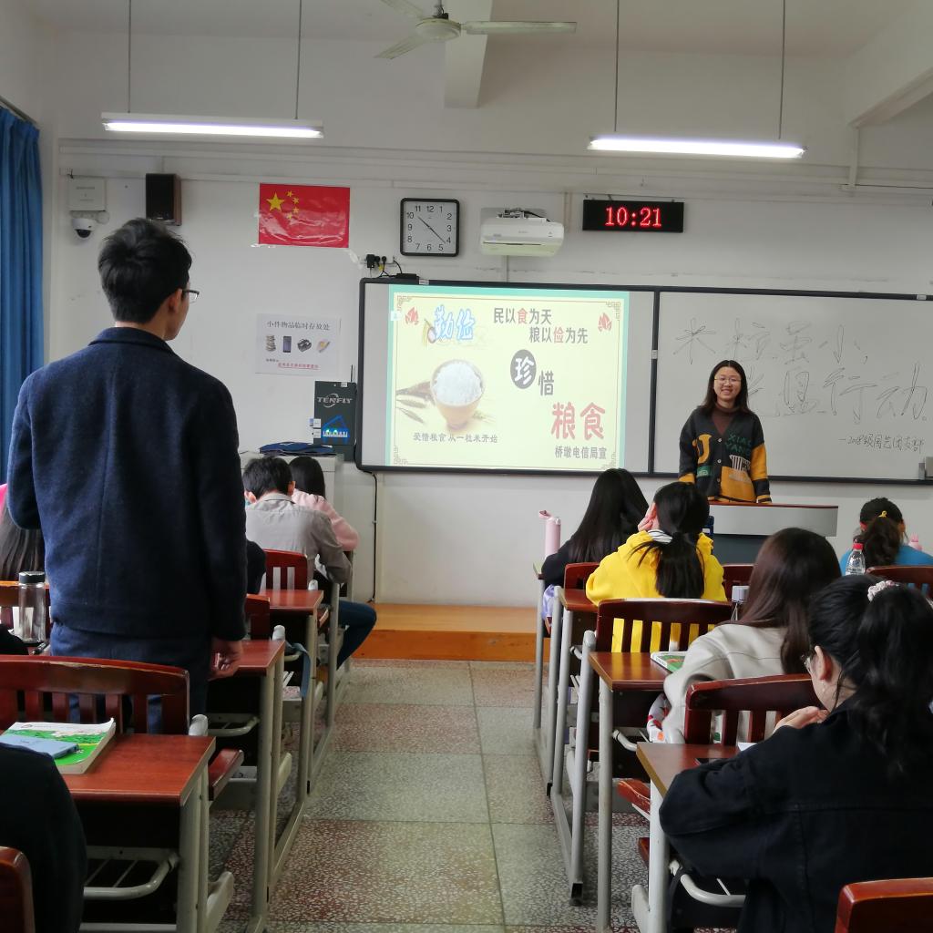 各班在开展活动的过程中,班委们精心准备了PPT,以文字和图片的形式向同学们展示当今粮食的浪费情况,并呼吁同学们积极响应光盘行动。其次,通过观看节约粮食相关视频,让同学们知晓节约粮食、光盘行动的深远意义。最后,同学们都意识到粮食的价值与意义,并发表了自己对节约粮食的看法,同时表明会积极加入到光盘行动的队伍中。
