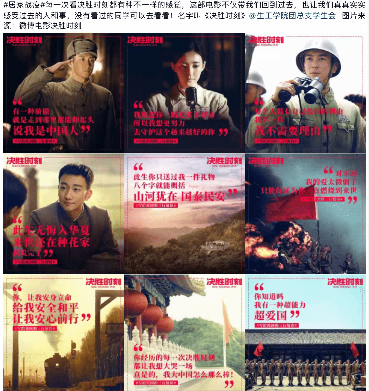 4月18日,我院发布第十九弹打卡活动——电影赏析。我院向同学们推荐了六部爱国热血电影,同学们既可以通过观看爱国影片,体会祖国走向强盛的曲折历程,也可以观看喜爱的电影,帮助自己排遣学习压力,积极面对生活。观影后,同学们对自己观看的影片进行打卡分享,感受电影带来的不同的体验,并带动身边的人参与到活动中。随后,我院团总支学生会公众号将同学们的观影汇总,带领同学们重温红色回忆,感受家国情怀,并激励同学们以赤子之心投身于新时代中国特色社会主义的伟大事业中去。