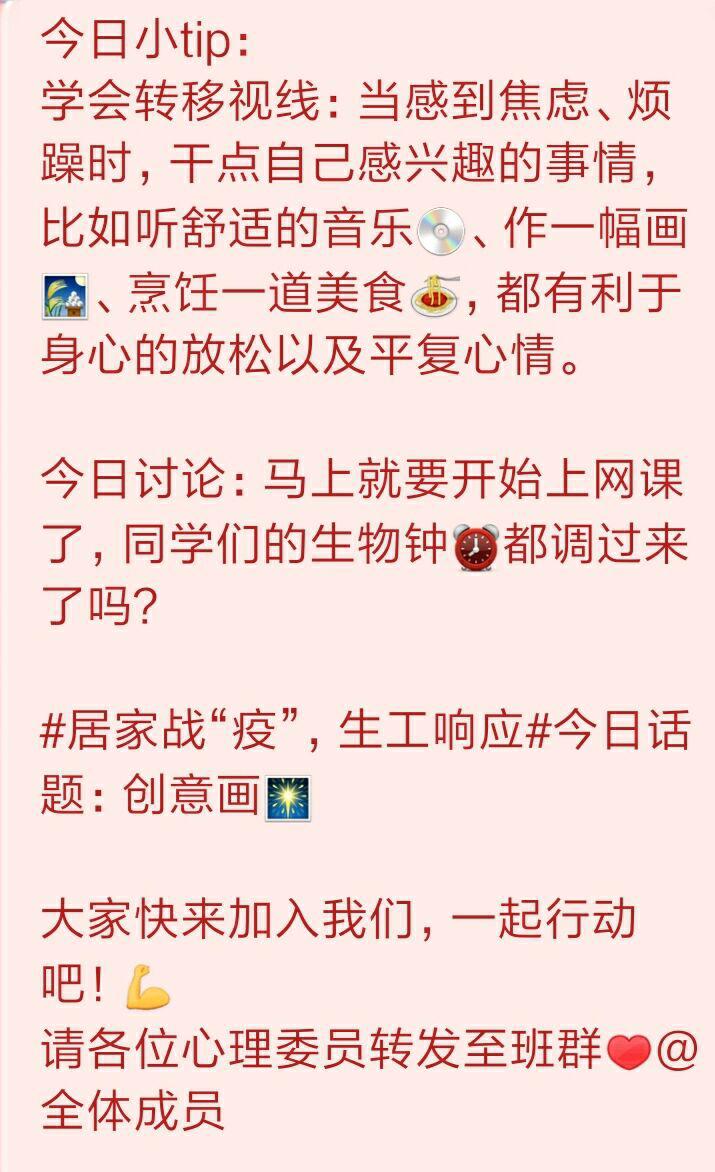 2月22-24日,主要进行疫情心理健康方面的疏导。活动期间,由我院学生会心理健康部每日发布心理健康小贴士,向同学们分享如何充实时间,放松心情,缓解焦虑等。活动初期,小贴士分成三个板块:一是提供减压方式;二是每日份讨论话题;三是号召同学们参加“生工响应,居家战‘疫’”打卡活动。2月25日至3月5日,主要进行学习压力方面的疏导。通过咨询各班学习委员,了解到同学们在线上学习时,导致出现焦虑的现象,针对同学们提出的意见,积极做出相应措施,有效解决同学们的问题,缓解学习压力。
