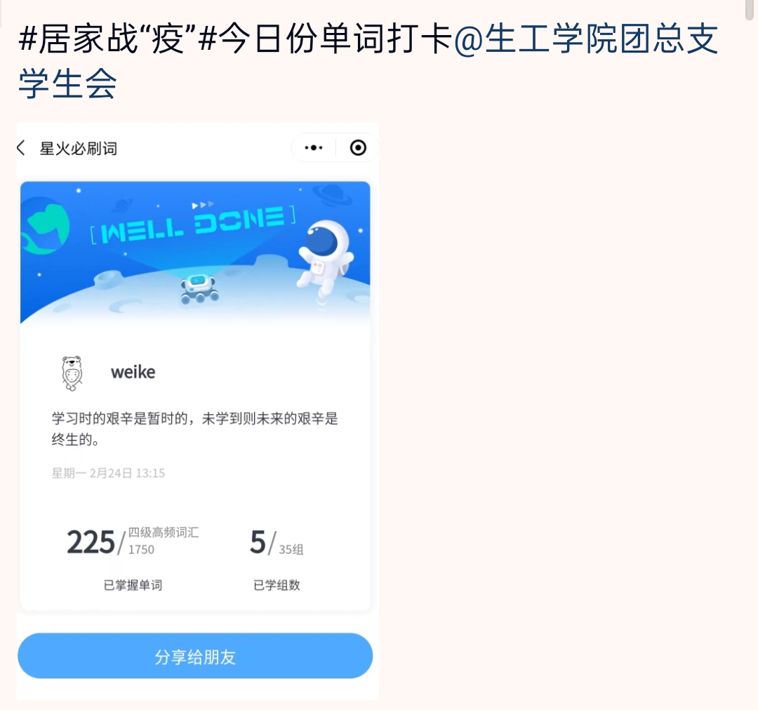 2月26日至3月2日,我院共发布两弹线上打卡活动:英语学习及美食制作,我院同学积极响应,晒出自己“宅”家打卡的照片。英语学习打卡方面,同学们背诵四六级单词,阅读外国经典文献,了解时事政治,熟练掌握英文语法;美食制作方面,火锅、烙饼、清汤面等,应有尽有,琳琅满目。其中,亮眼作品在我院团总支微信公众号上发表展示,号召更多同学展示生活小技能。居家隔离的同时,提升自我能力,做到居家学习两不误!
