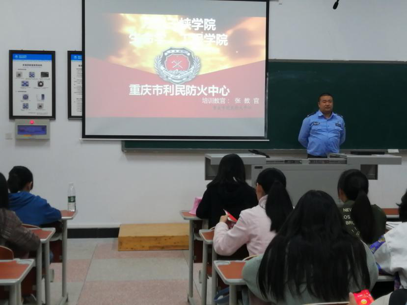 10月11日19:00时,重庆市利民防火中心的张教官为学院18级新生、高年级班团干部讲解了消防安全方面的知识。主要内容是:如何识别犯罪嫌疑人、遇到罪犯时如何进行自救和求救、各种犯罪案例以及特殊救援手电的三大特点等。在整个演讲中,我院同学们积极地和张教官进行互动,认真学习张教官所讲的自我防卫以及在危机时机如何向他人求救。