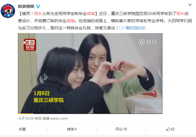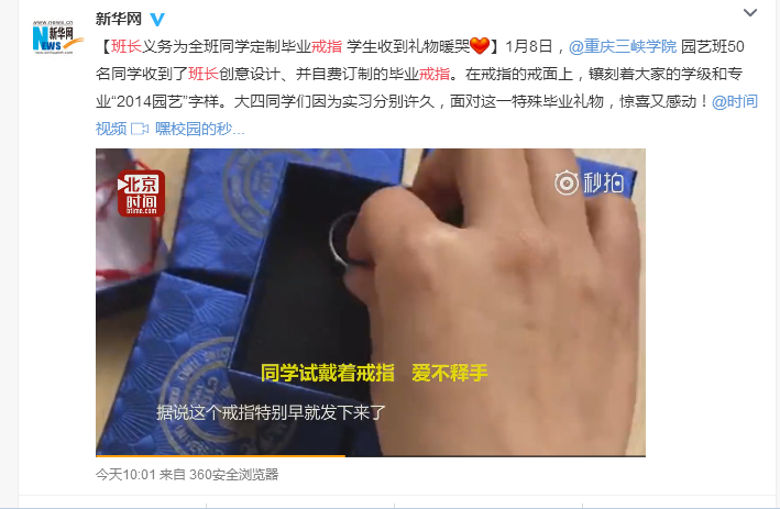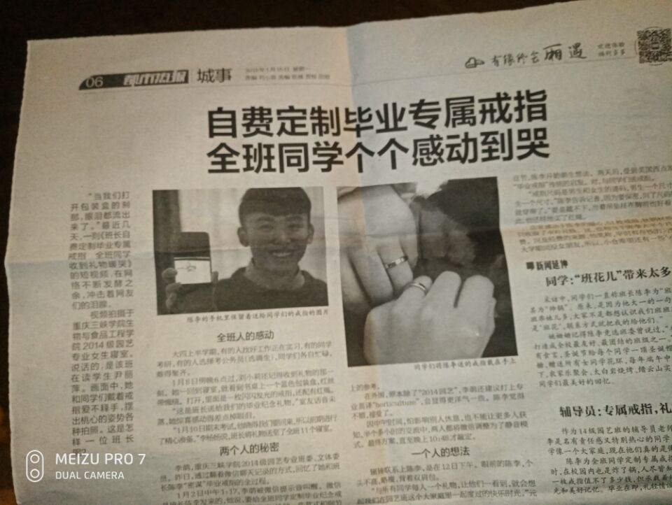 “当我们打开包装盒的刹那,眼泪都流出来了。”近日,一则“班长自费定制毕业专属戒指,全班同学收到礼物暖哭”的新闻备受关注,目前已被人民网、新华网、中国日报、新浪、重庆晚报、重庆晨报、扬子晚报、万州电视台等16家媒体转载。