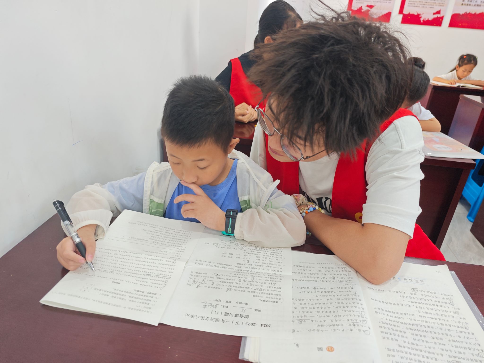 课堂伊始,志愿者以“一对一”辅导模式,细致讲解课业难点、批改作业,夯实孩子们的知识基础。随后,志愿者通过播放趣味动画短片、讲述历史典故,将端午节的起源传说、文化底蕴及习俗内涵娓娓道来,让传统文化变得鲜活生动。
