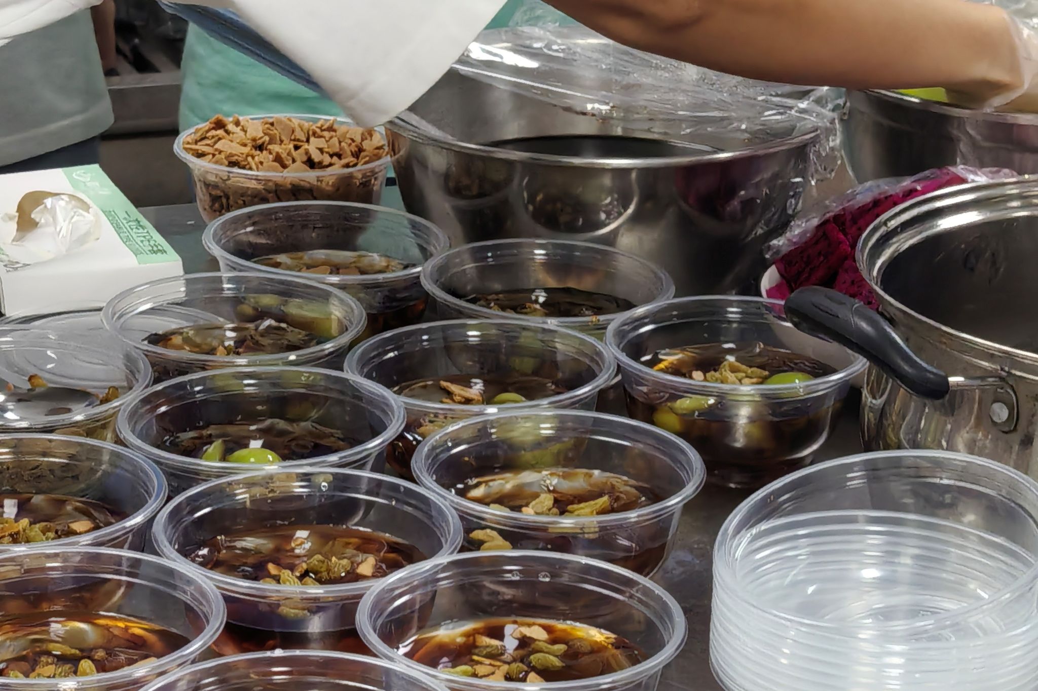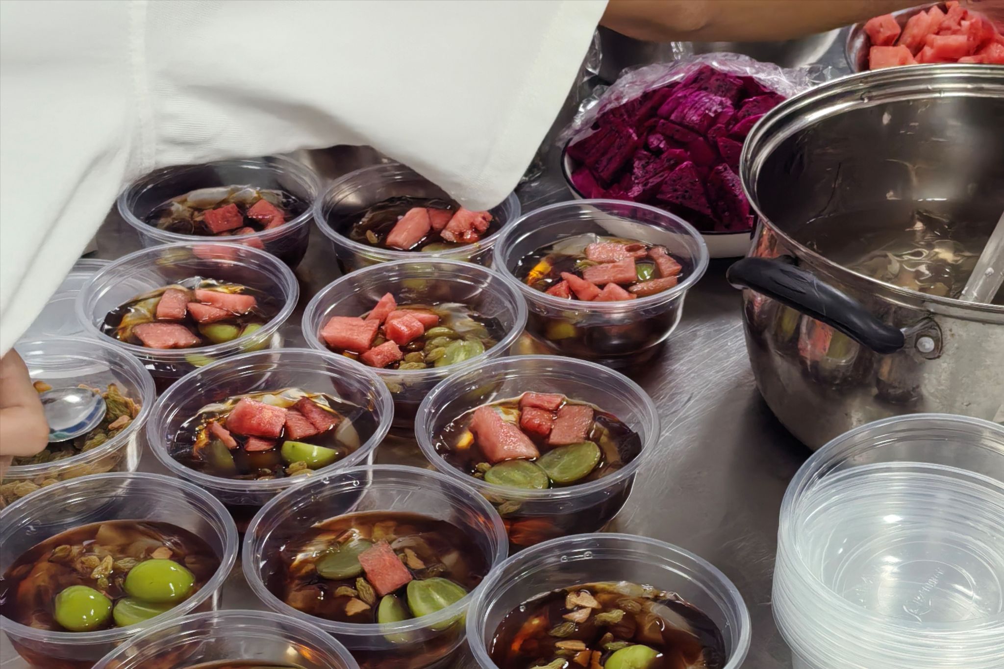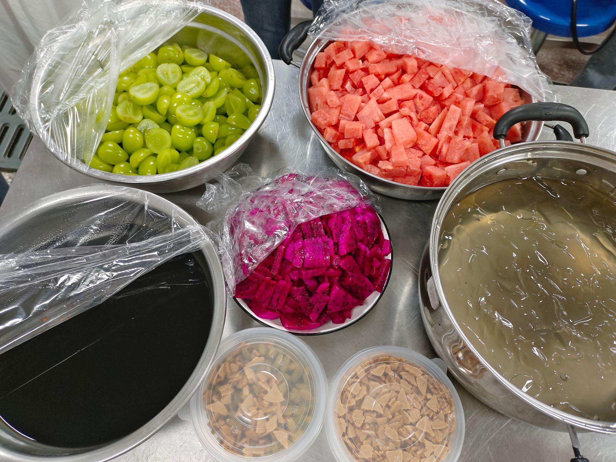 活动期间,工作人员分工明确,从清洗葡萄、分切西瓜等配料准备,到融化红糖、制作冰粉,每一个环节都有条不紊地进行,充分展现了团队的协作能力。制作完成后,新美味冰粉由工作人员统一送至山腰游泳池招新处分发给全校新生,受到了同学们的热烈欢迎。