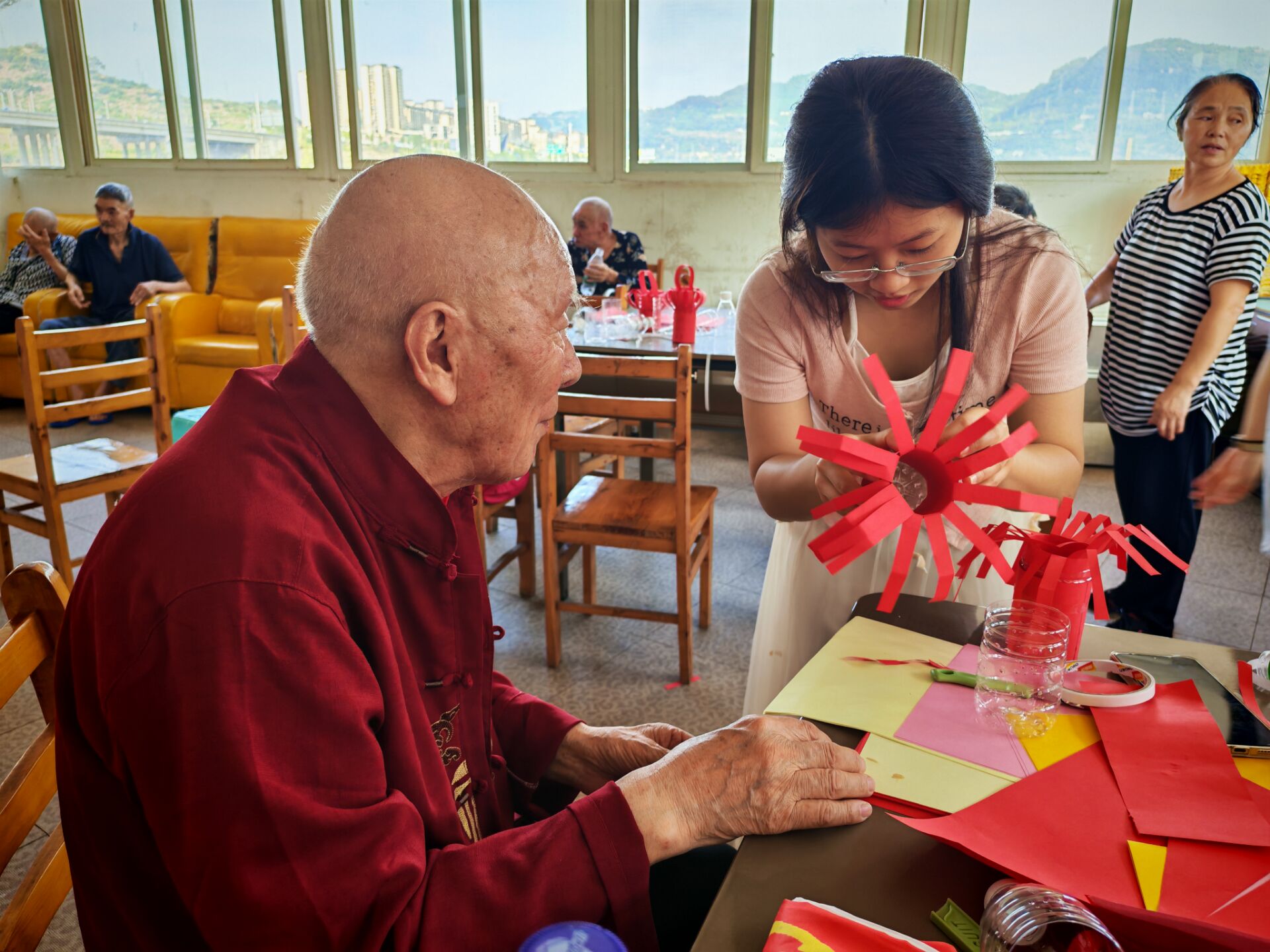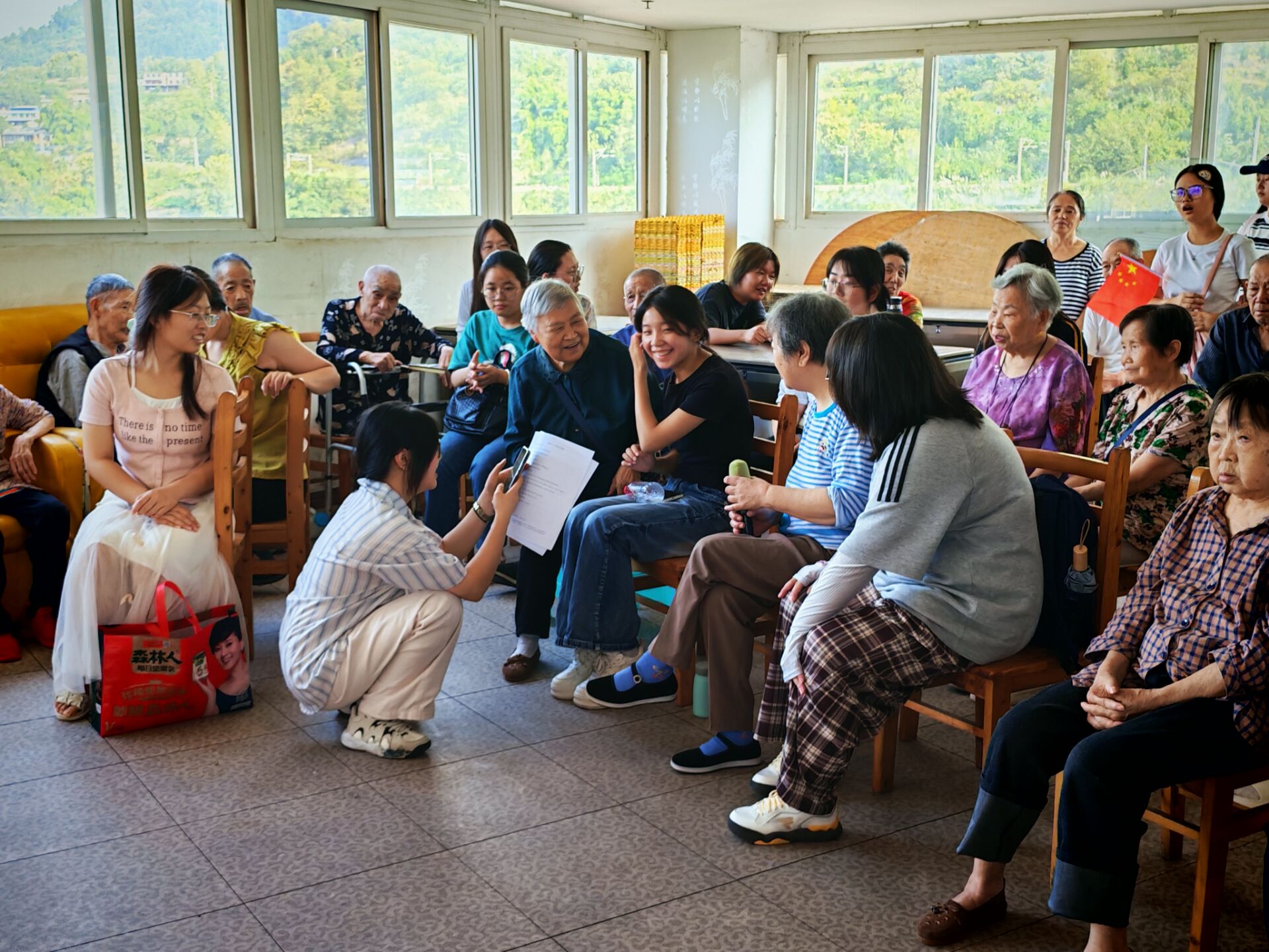 活动当天,志愿者们早早来到老年公寓,与老人们亲切互动。在交流环节,志愿者们耐心地与老人聊天,倾听他们的人生故事,询问他们的生活近况。志愿者们带来了精心准备的大合唱,激昂的歌声传递着青春的活力与对祖国的热爱;饱含深情的诗词朗诵,抒发了对传统佳节的美好祈愿,也让老人们感受到了文化的魅力。