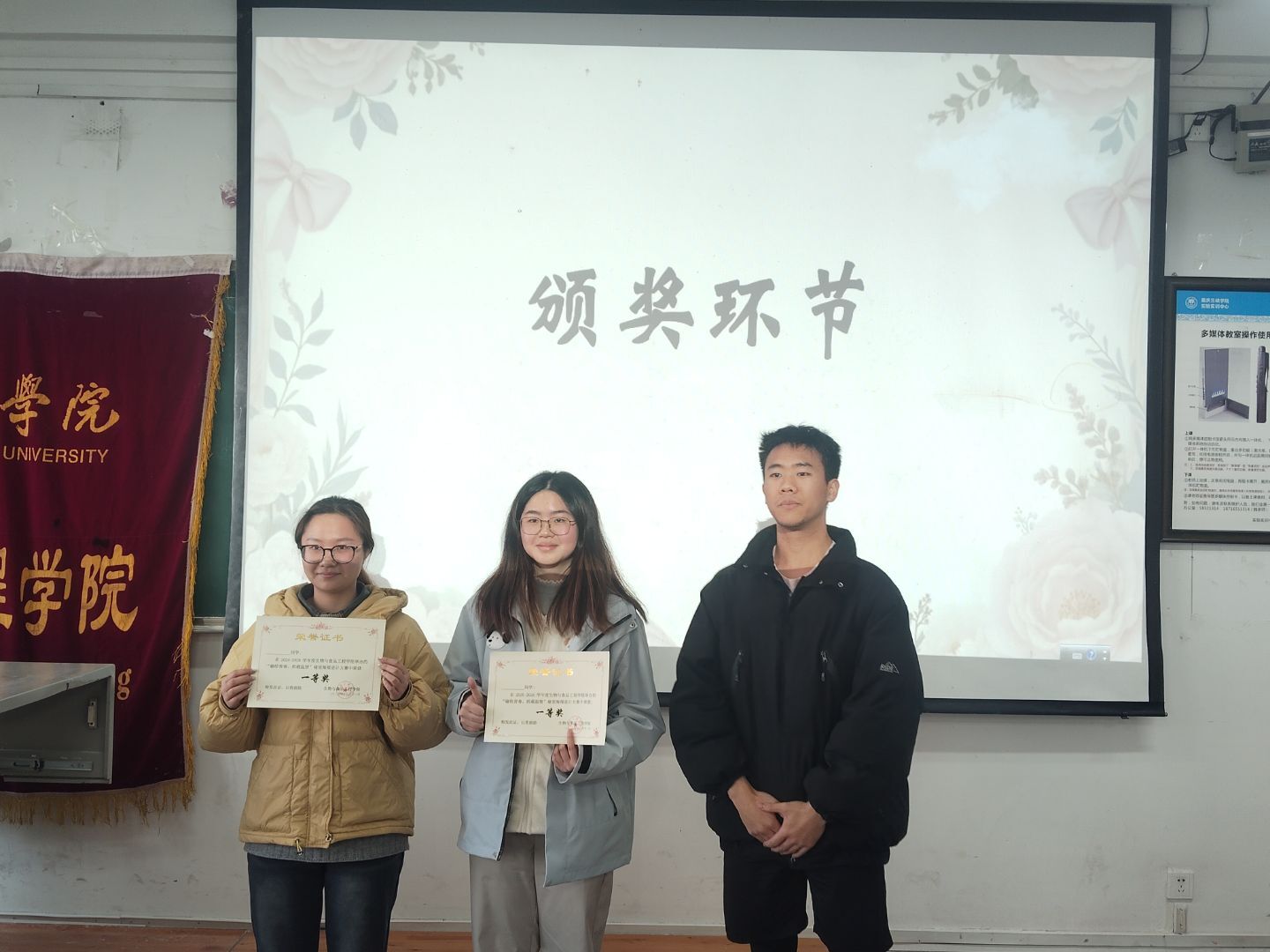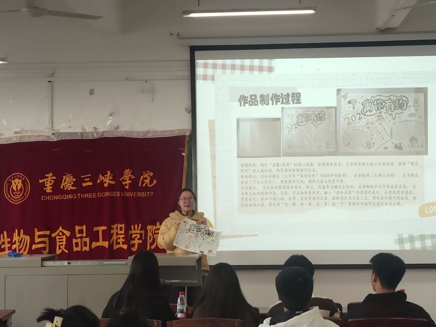 决赛现场,七组优秀参赛寝室携精心手绘的海报逐一展示。选手们以PPT为媒,生动阐述海报的创作灵感与设计巧思。作品内容聚焦寝室日常的温馨场景与室友陪伴的成长片段,色彩明快、笔触生动,充分展现出学子们饱满的青春热情。讲解过程中,各寝室分享了从构思到成品的合作历程,体现出紧密的团队协作能力与饱满的集体创造能力,让现场观众深切感受到寝室之间浓厚的凝聚力。