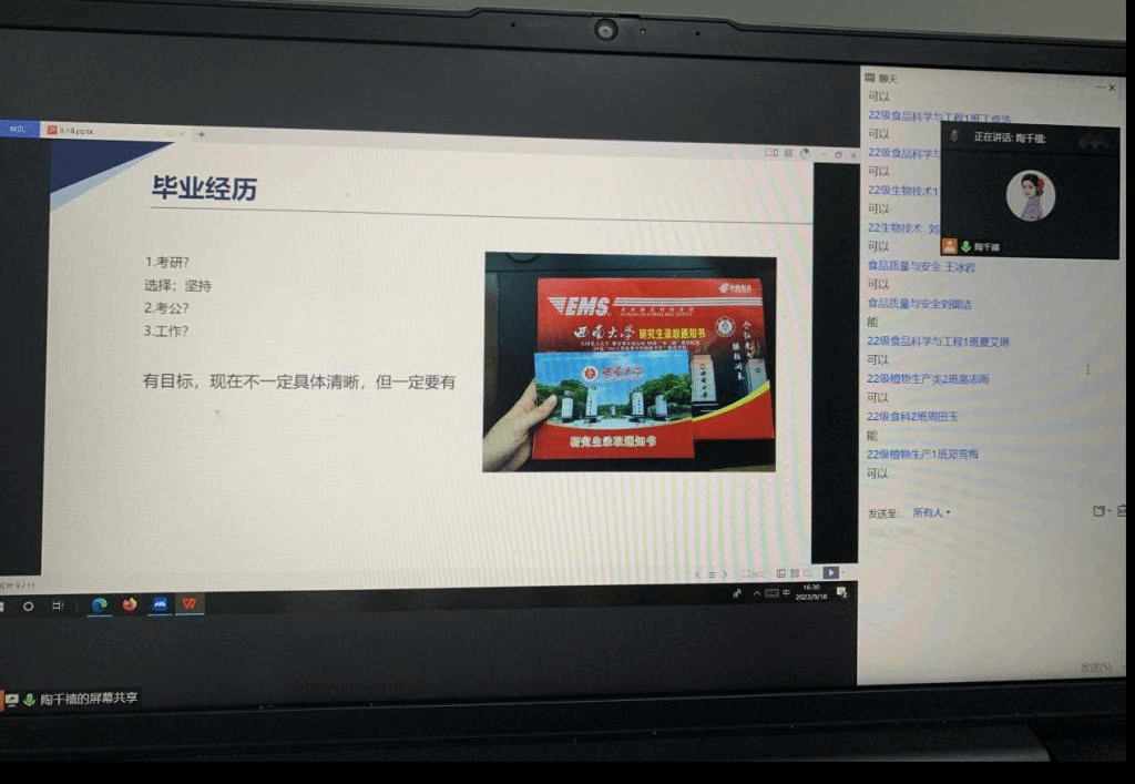 黄瑶是2015级食品科学与工程专业毕业生,就职于重庆工程职业技术学院,负责继续教育学籍学历和社会培训工作,陶千禧是2018级风景园林毕业生,目前在西南大学硕士在读。两位校友结合自己在校期间的学习工作经历,分析了当前的就业形势,分享宝贵经验。黄瑶从学姐、党员、教师的三个身份出发,为22级新生提出了多条建议,希望大家能明确学习目标,不随波逐流。陶千禧从现在的考研竞争出发,鼓励大家坚定自我,及早规划,通过自身经历激励同学们树立专业理想。
