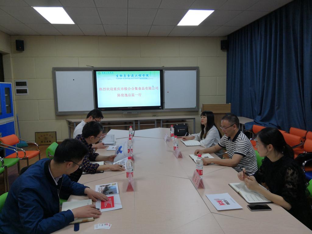 4月18日下午,我院在慎思楼2栋216召开了与重庆极合合集食品有限公司合作交流会。参与本次交流会的有重庆极合合集食品有限公司陈俊逸总监、经理周玉兰、喻琴及我院肖国生院长、周浓副院长、曲留柱老师。本次交流会旨在与企业合作培养人才,增强我院学生本领。